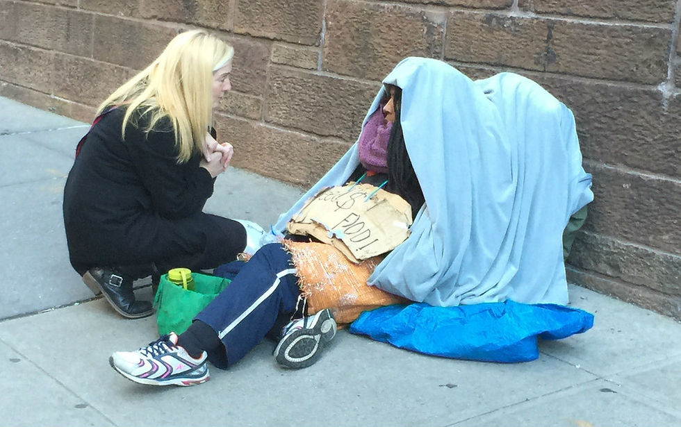 I'm as guilty as the rest. I ordered a shitload of stuff for my family on Amazon, then got this photo from an 82-year-old friend. It isn't a good picture, but it shows a young blond girl stooping down and talking thoughtfully to a street person, wrapped in bags.